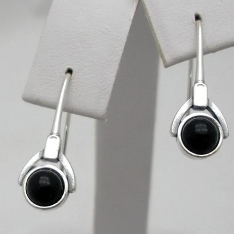Vintage Simple Silver Color Metal Round Inlaid with Black Stones Dangle Earrings for Women
