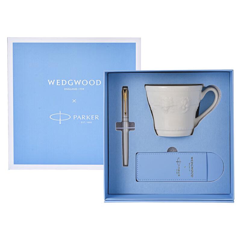 Celebrate special occasions with this elegant gift set, featuring a beautiful Wedgwood Joyful Holiday ivory white mug set and a sophisticated Parker Vector XL white gold clip rollerball pen, perfect for business or professional use.