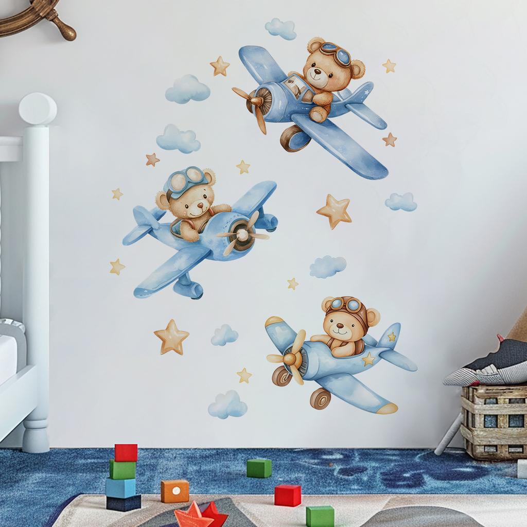 Cartoon Hand-Painted Bear Airplane Wall Sticker Kids Room Bedroom Entrance Home Wall Decoration Self-Adhesive