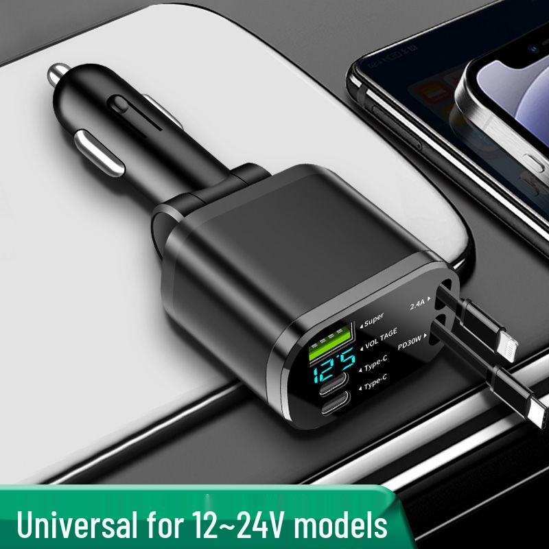 Digital Display Car Charger with Retractable PD Cable - Fast 5-in-1 Cigarette Lighter Charger