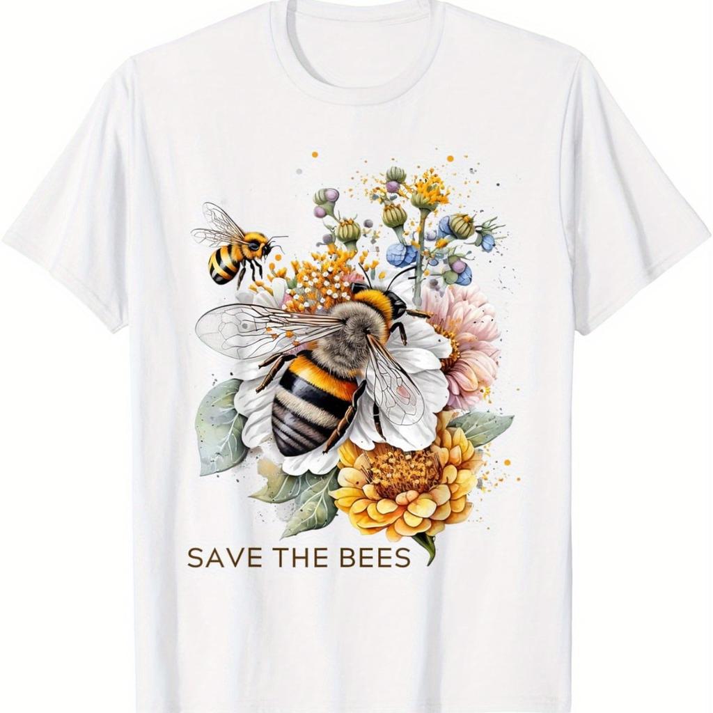 Save The Bees Graphic Tee Men Cotton Floral Pollinator Print Short Sleeve T-Shirt Casual Daily