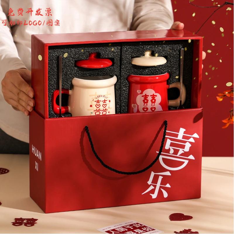 Couple cups, a pair of festive national style ceramic cups, wedding mugs with lids and spoons, Valentine's Day gifts, water cups, gift boxes.