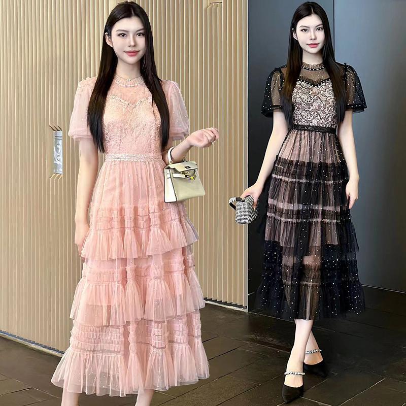 Runway Summer Holiday Sundress Black Lace Tulle Wedding Prom Sequins Dress Women Short Sleeve Flower Embroidery Dresses