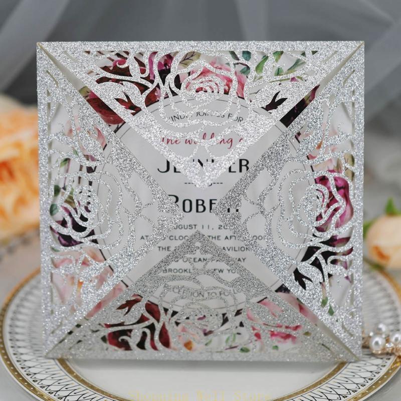 KX4B 20pcs/set Wedding Invitations Cards Glitter Rose Flower Greeting Card Invite Envelopes Bridal Shower Supplies