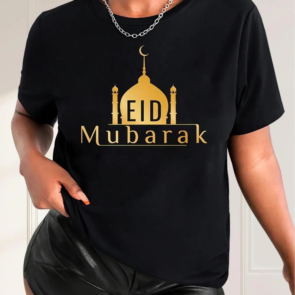 1pc EID Mubarak Crescent Moon Print T-Shirt for Women, Casual Crew Neck Short Sleeve Top, 100% Knit Fabric, Medium Stretch, Fash
