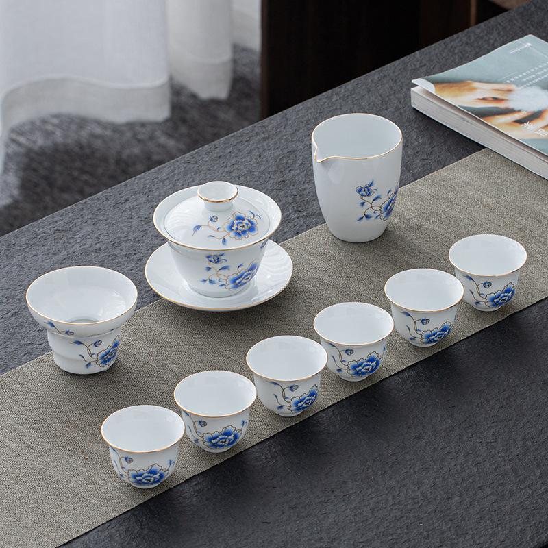 Porcelain Kung Fu Ceramic Gaiwan Tasting Household Simple Blue and White Tea Cup Gift Box Set Customizable Log