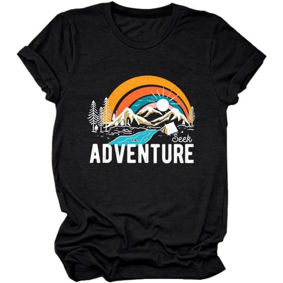 Adventure Shirt Retro Mountain Hiking T-Shirt Women Funny Nature Graphic Tee Short Sleeve Outdoor Top Camping Tshirt, Black, Large