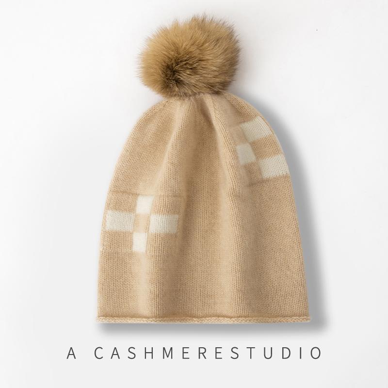 Women 100% Cashmere Beanie Hat Pom Pom Detail Mini Rolled Edge Knit Winter Warm Soft Slouchy Skullies Cap Cold Weather Accessory