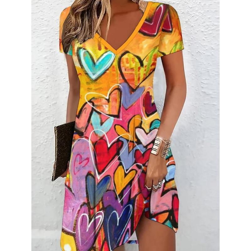 Ladies' Casual Valentine's Day Love Print Dress Suitable for Holiday Entertainment Short Sleeved V-neck Holiday Dress