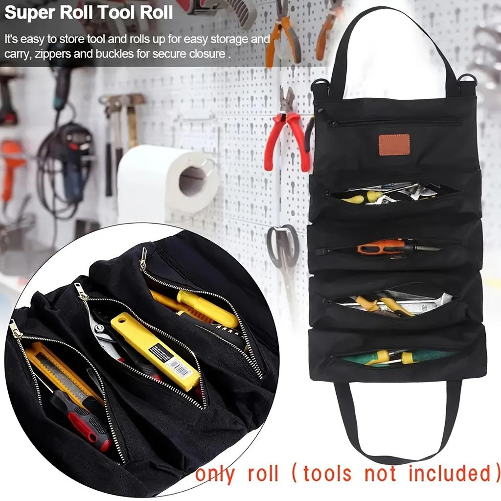 1 pc Tool Roll Organizer, Wrench Roll Up Pouch Bag with 5 Zipper Pockets Canvas Tool Roll, 16 OZ Canvas Wrench Tool Organizer
