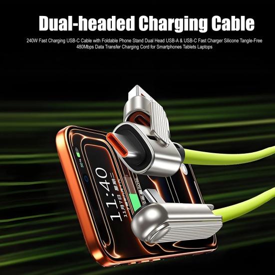 This dual-headed data cable offers universal compatibility with USB-A to USB-C and USB-C to USB-C connectors, making it perfect for smartphones, laptops, tablets, and other USB-C devices. Featuring a built-in foldable T-shaped hands-free stand, it allows convenient video watching, calls, or browsing while charging. Delivering ultra-fast 240W charging and 480Mbps high-speed data transfer, this cable ensures rapid power delivery and efficient file syncing.