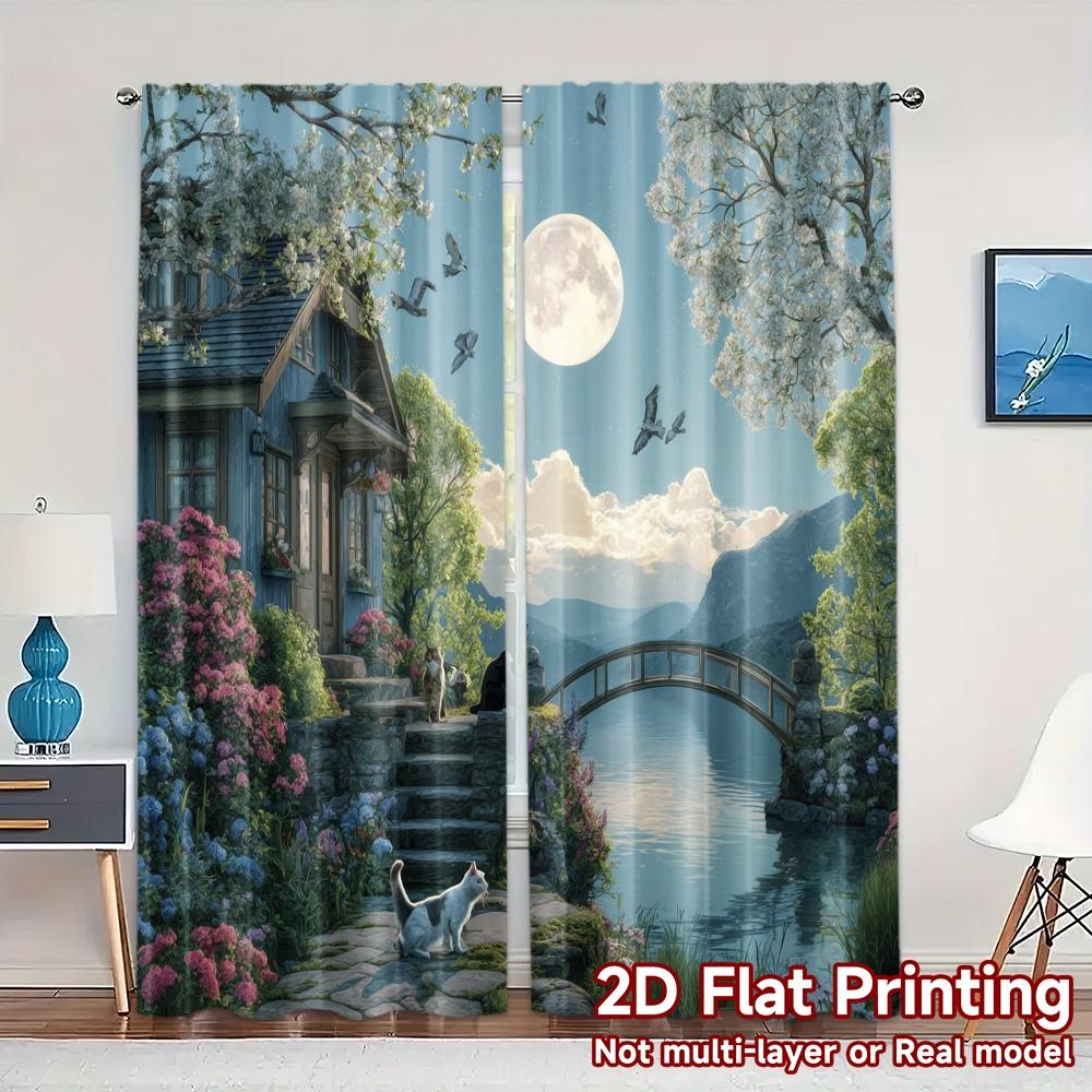 2pcs 2D FLAT PRINTING Curtains (Without Rod) Moonlit Haven Modern Pattern Curtains Versatile Polyester Curtains Festive for