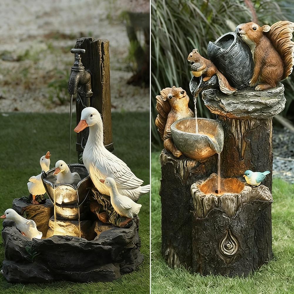 Duck /Squirrel Fountain Ornament Garden Duck Family Statue Outdoor Yard Miniature With Light Garden Decor For Patio Balcony Lawn