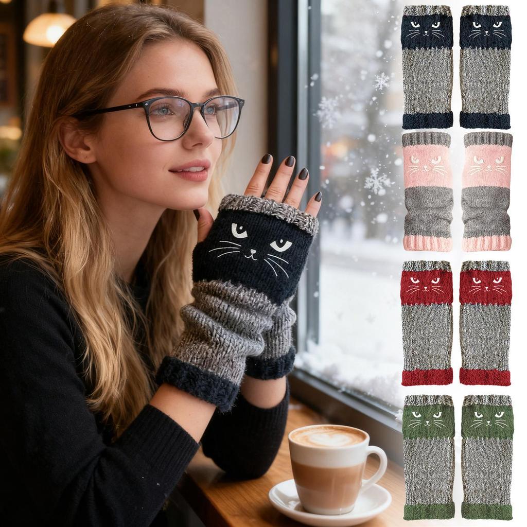 Embroidered Cat Gloves Women's Cotton Fingerless Gloves Knit Block Stitching Mittens Women's Fingerless Gloves