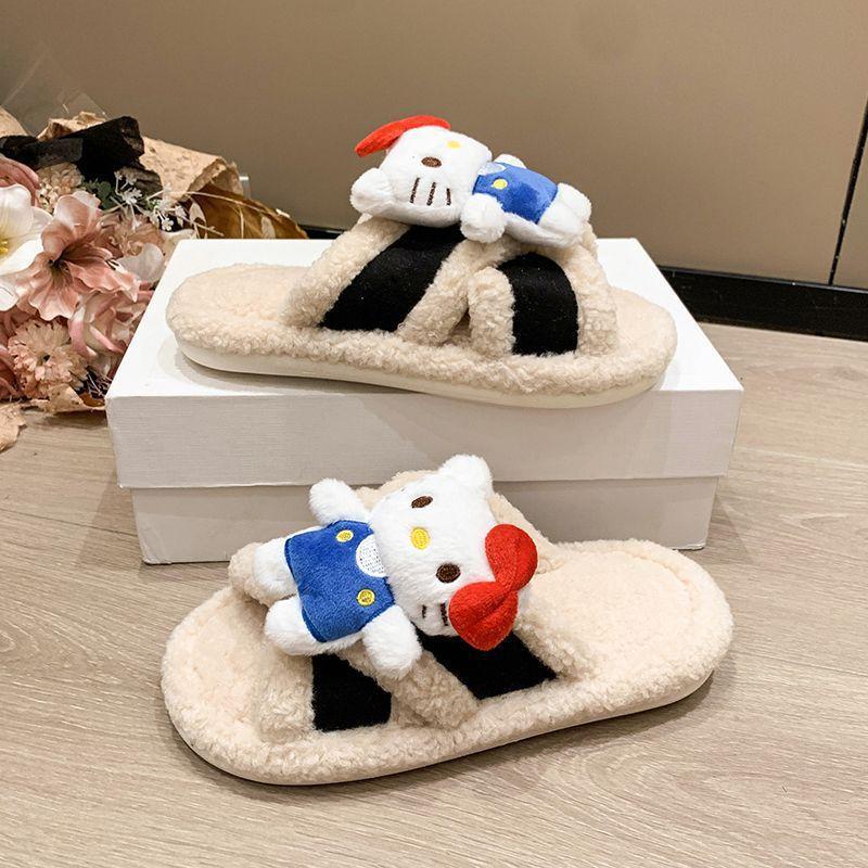 Versatile non-slip fluffy cotton slippers for women wearing cute cartoon one-word slippers for women