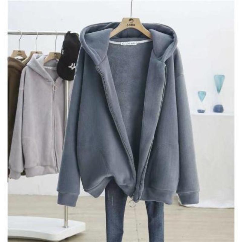 Hooded for Women Autumn Winter Loose Velvet Thickened Cardigan Zipper Fashionable and Versatile Solid Color Long-sleeved Top