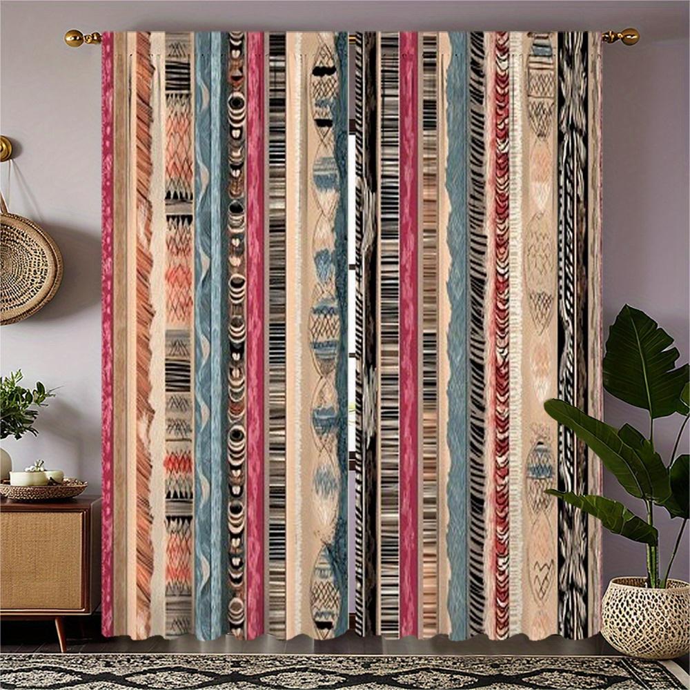 2pcs Bohemian Ethnic Curtains - Semi-Sheer Window Drapes with Rod Pocket Tribal Stripe patterns in Beige Blue Pink