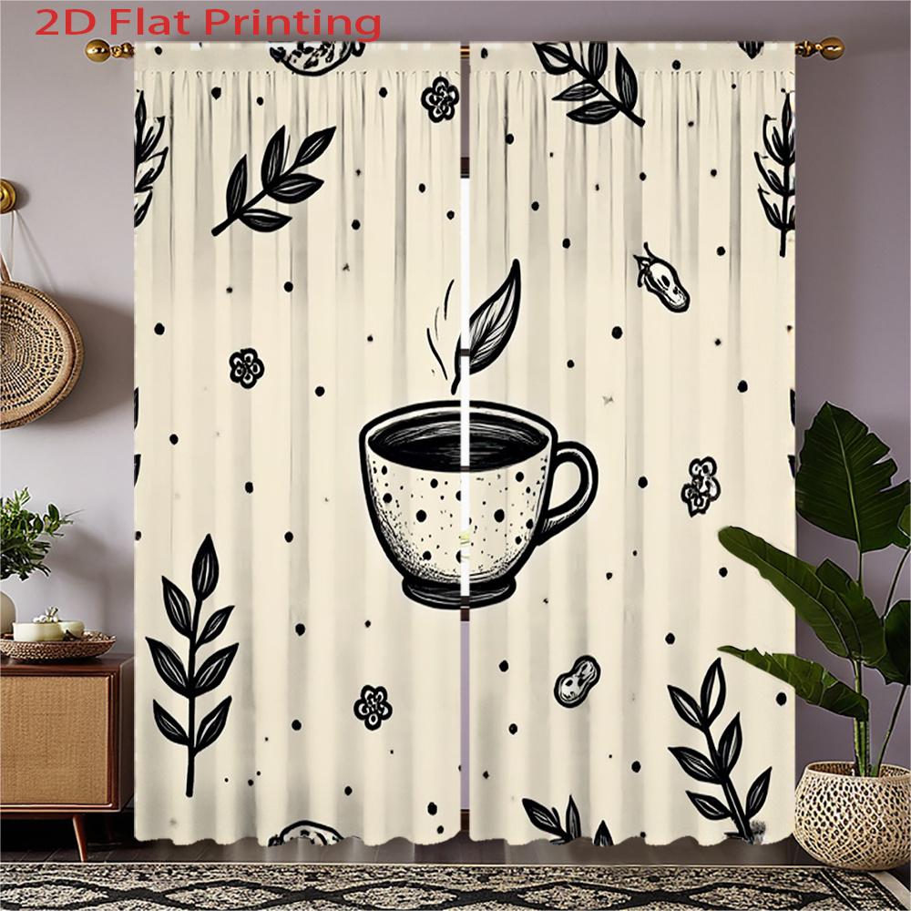 2D Flat 2pcs 2D Flat Printing Curtains Coffee Cup Leaf Floral Pattern Dot Print Rod Pocket Velvet Fabric Window Drapes for Hom