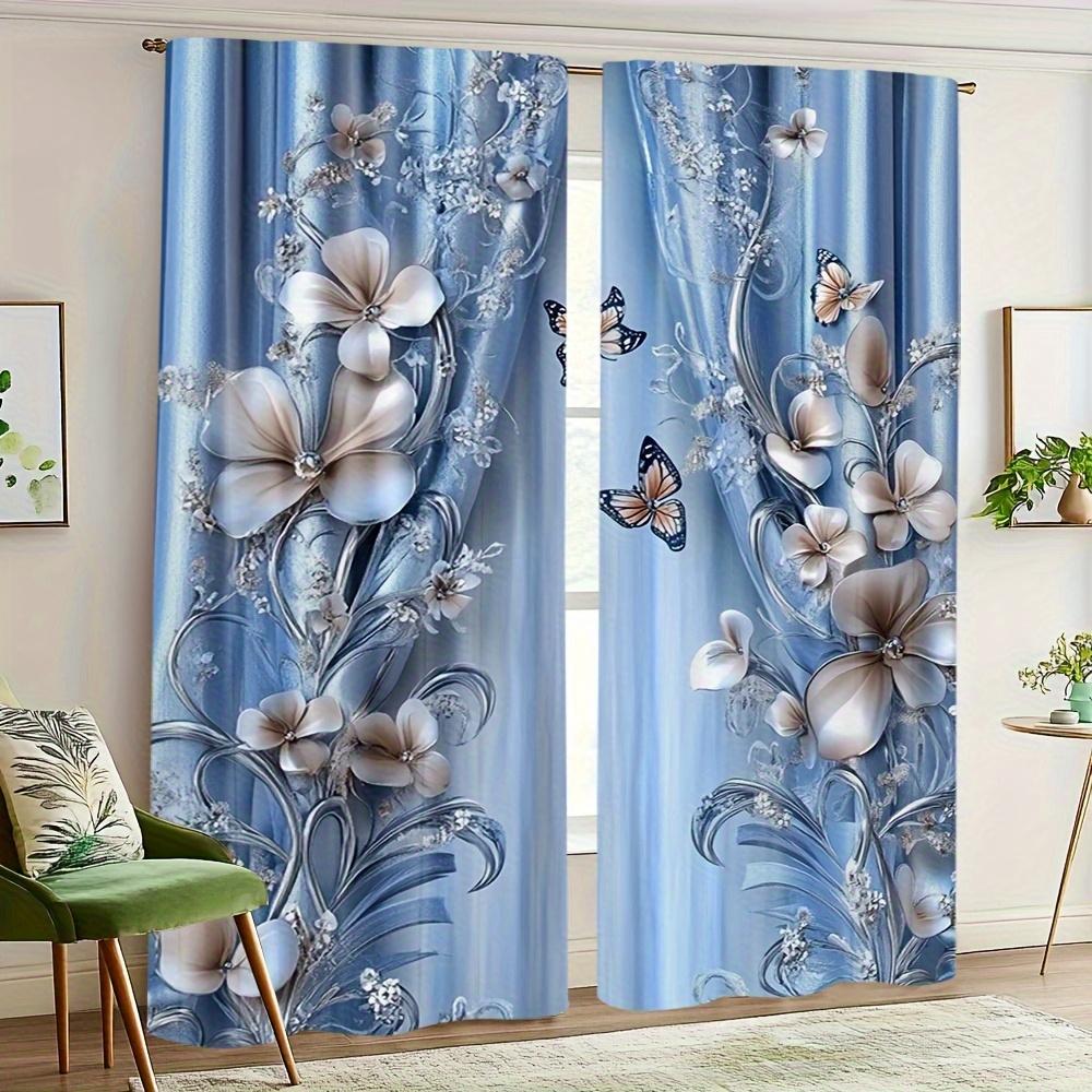 2 Pcs Elegant Vintage Blue Floral & Butterfly Print Curtains – Rod Pocket Design for Bedroom Living Room Office Kitchen