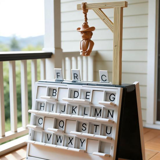 Bu ilgi çekici kitap masa oyunu, büyüleyici ahşap tarzı bir yapıya sahip benzersiz dönen bir darağacı tasarımına ve her yanlışta giderek "asılan" küçük bir kovboy şapkalı kuklaya sahiptir, bu da eğlenceyi ve görsel heyecanı artırır.. Etkileşimli çift taraflı alfabe tahtası, tam İngiliz alfabesini içerir ve oyuncuların harfleri sezgisel olarak kelimelere çevirmesine olanak tanır.
