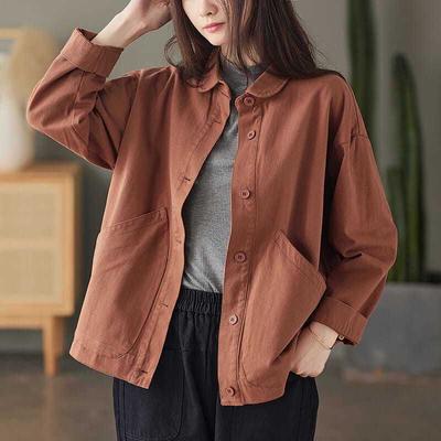 Pamuklu Ceket Kadın Sonbahar Retro Twill Pamuklu Düz Renk Büyük Cep Tek Düğmeli Bol Günlük Üst