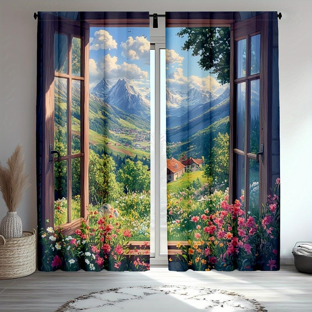 2pcs Nature-Inspired Mountain Blackout Curtains Spring Sky and Flower Insulated Drapes for Bedroom Living Room