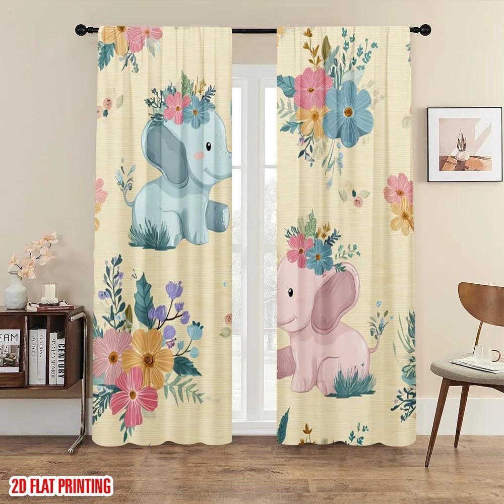 2pcs Blooming Floral Elephant Curtains Room Darkening Nursery Decor Rod Pocket Curtains