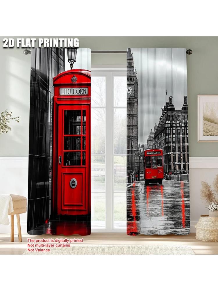 2pcs Curtain Popular print London Telephone Booth Polyester (without rod) Room Decor Perfect for Study Living Room Kitchen