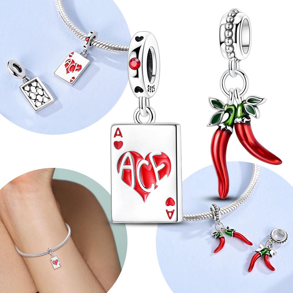 Originalcopper Red Chili Pepper Heart Poker Card Pendant Bead Fit Bracelet Valentine'S Day Gift Women Jewelry Diy Accessory