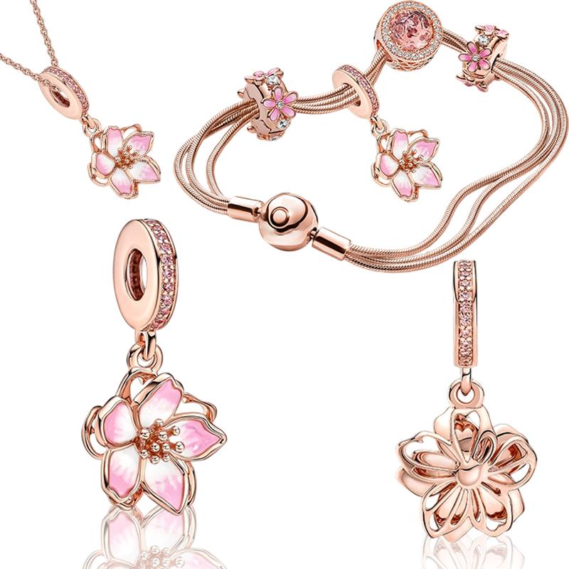 Pink Cherry Blossom Dangle Daisy Spacer Clip Charm Beads Fit Original Bracelet Necklace Bead For Diy Jewelry Women Gift