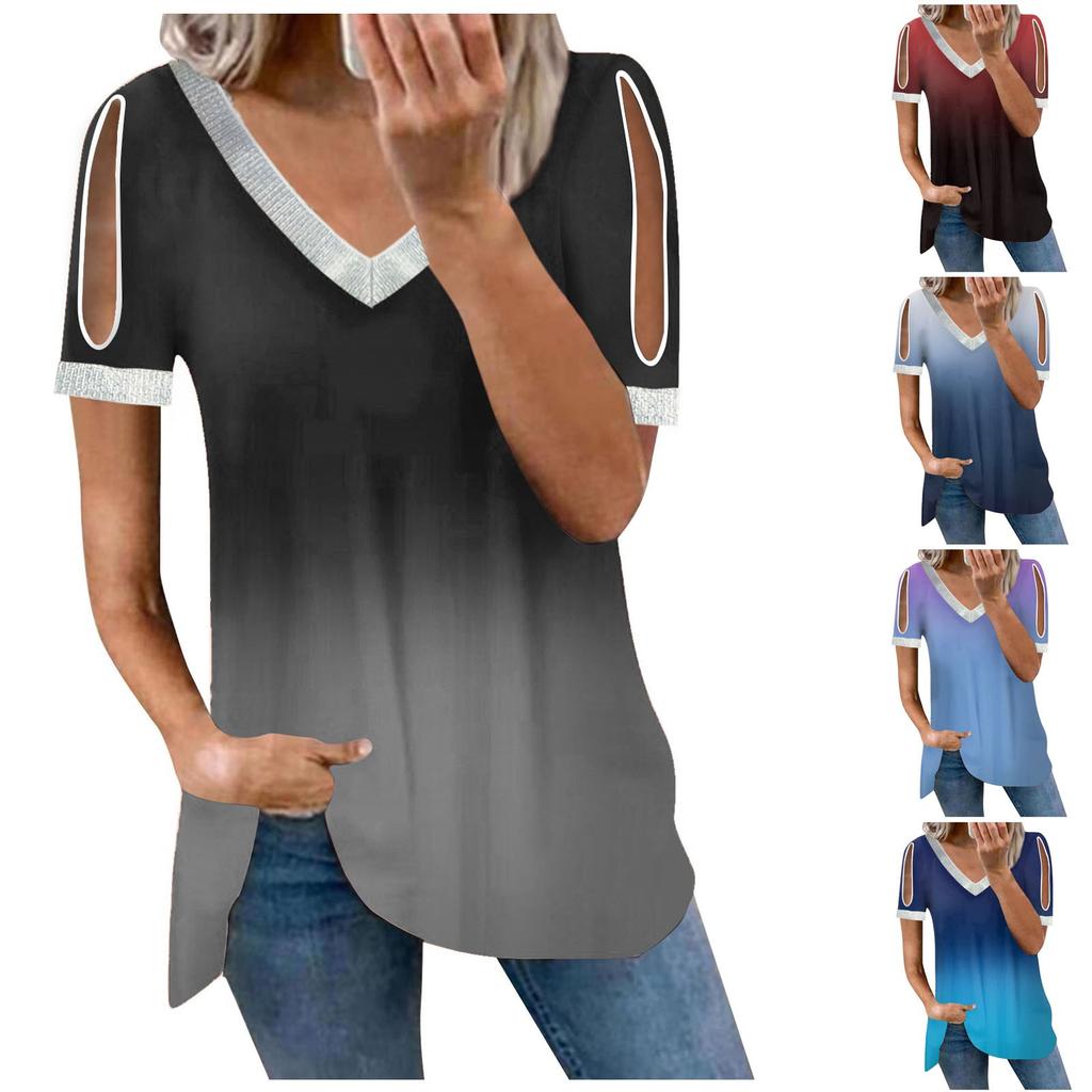 Women's Summer Loose T-shirt Gradient Color Printed Casual V-neck Sequin Short-sleeved Top