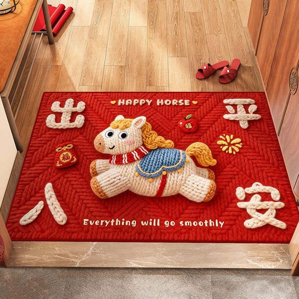 Cute Horse Pattern New Year Door Mat Red Bath Mat Water Absorption Soft Foot Mat Home Decorations