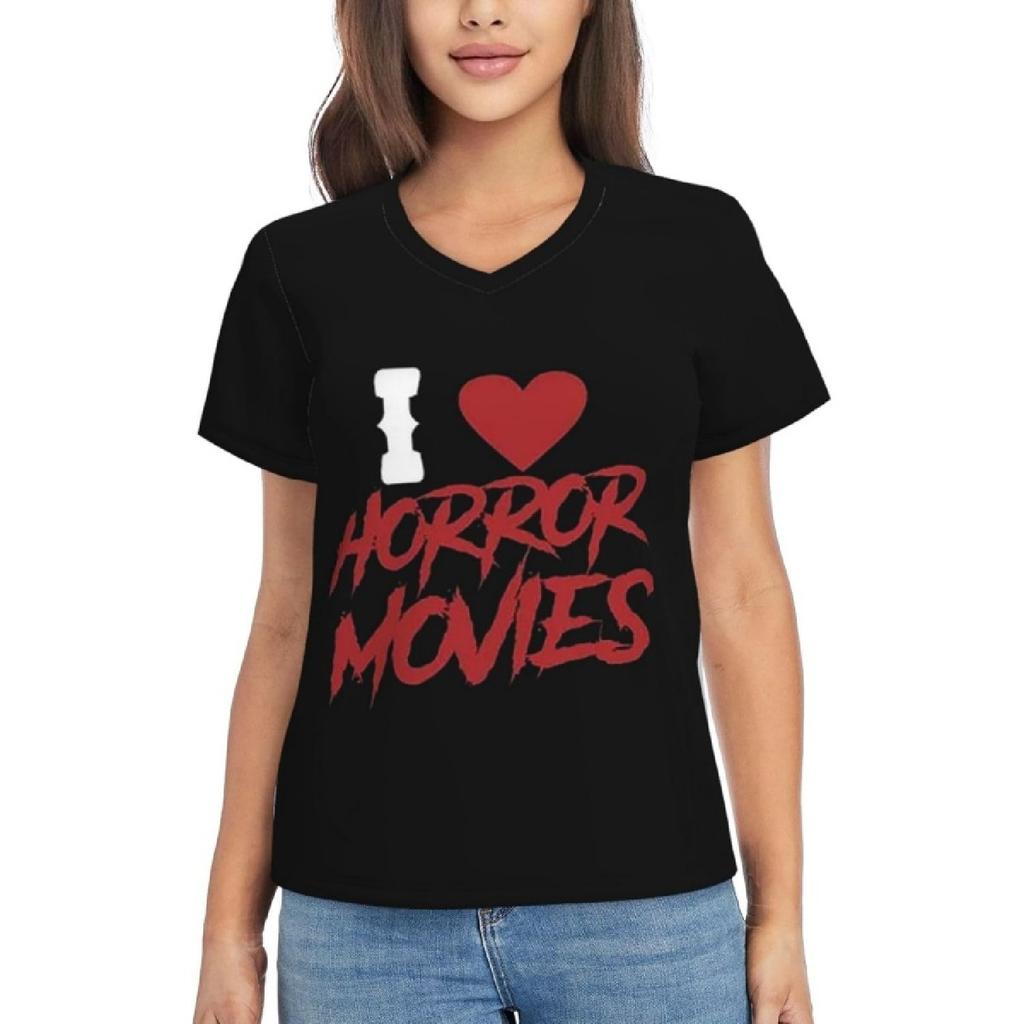 Rwraps Women's T-Shirt I Love Horror Movies T Shirt V-Neck Short Sleeve V Neck Tops Sport Tee Workout Undershirt