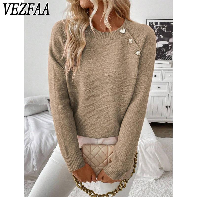 VEZFAA Kadın Modası Rahat Sonbahar Kış Düz Renk Baskılı Uzun Kollu O-Yaka Kazaklar