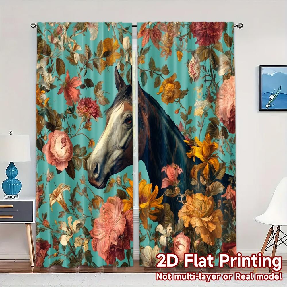 2pcs 2D FLAT PRINTING Curtains (Without Rod) Horse in Bloom Chic Curtain Chic Durable Polyester Curtains Room Decor for Living