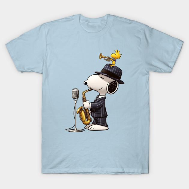 Men Black Print T-shirt Jazz Snoopy And Woodstock No-Cut Transfer Paper Print Cotton Tshirt