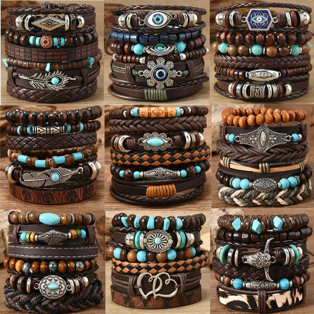 Cross-border beaded bracelet multi-layer vintage devil's eye love feather horn hand-woven multi-piece set