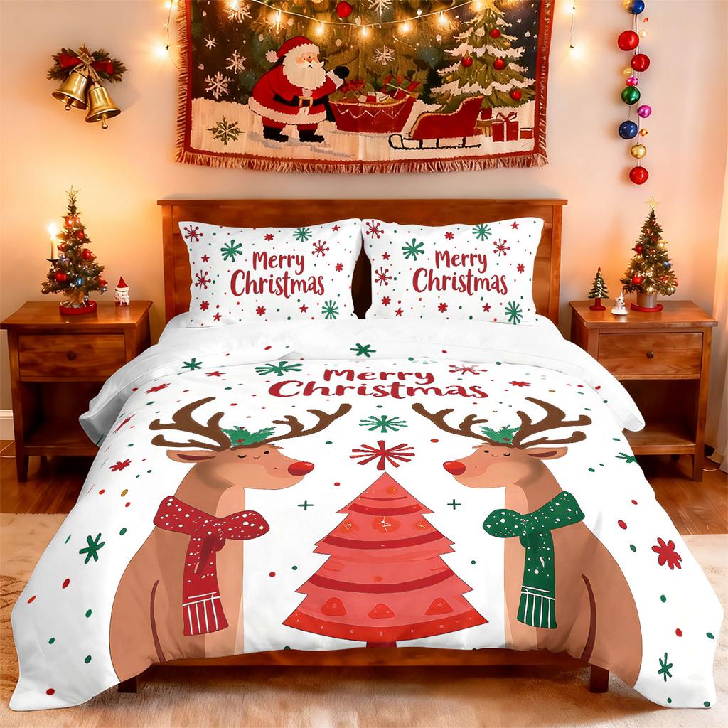 3pcs Merry Christmas Cute Reindeer Print Coreless Bedding Set Multi Size Bedroom Bedding Holiday Decoration Soft Comfortable