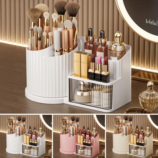 This cosmetic storage box features a sleek vertical pattern design, adding a touch of elegance to your dressing table or bathroom cabinet. Its 360-degree smooth rotating base allows easy access to all compartments, which are thoughtfully divided to organize makeup brushes, lipsticks, powders, lotions, and more.