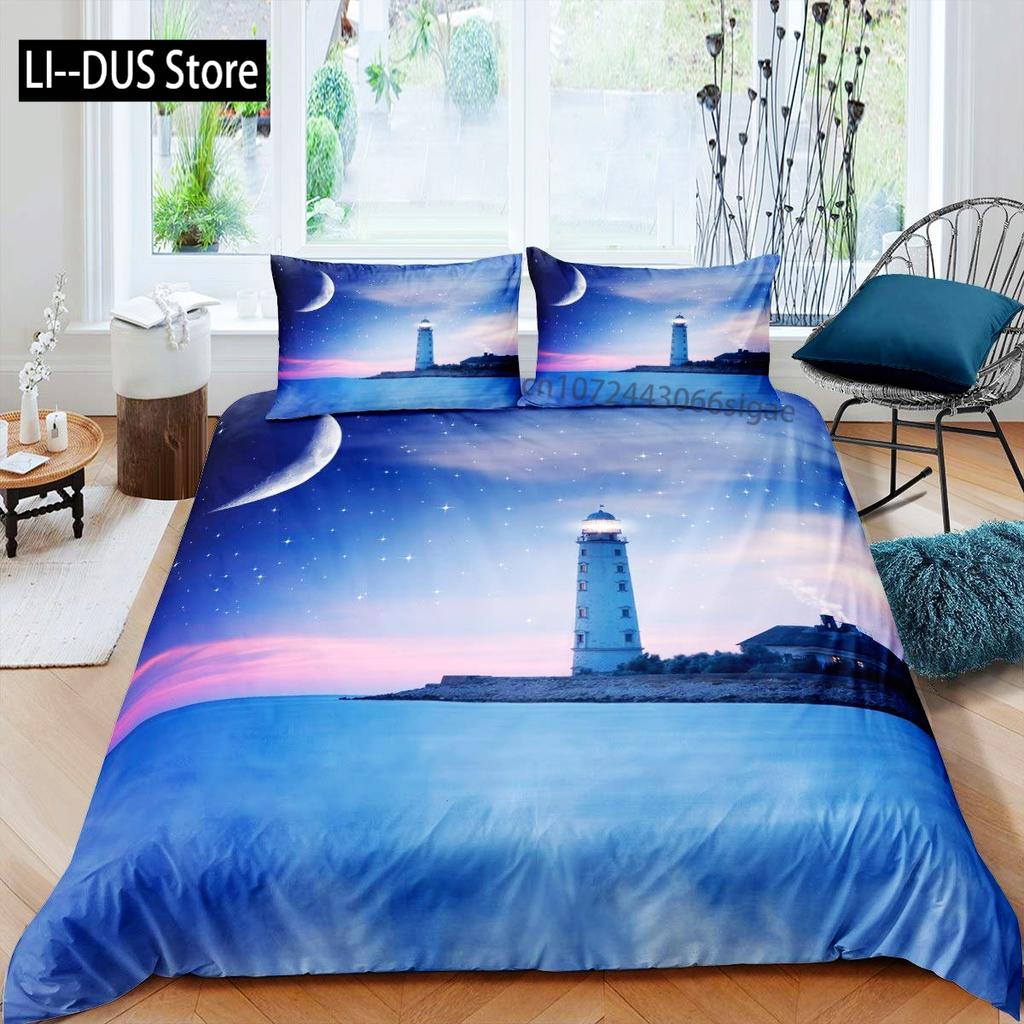 Lighthouse Duvet Cover Set Nautical Surfing Ocean Wave Bedding Set Queen Polyester Coastal Nature Theme Quilt Cover For Kids Boy