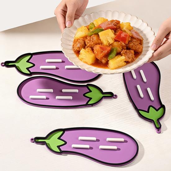 The non-stick surface resists stains and is dishwasher safe for easy cleaning. Versatile in function, it serves as a pot lid holder, soap dish holder, hot food potholder, or cutting board holder to meet various kitchen needs. Its charming cartoon patterns—including eggplant, carrot, Chinese cabbage, corn, and radish—add a playful touch while keeping your countertop neat and organized.
