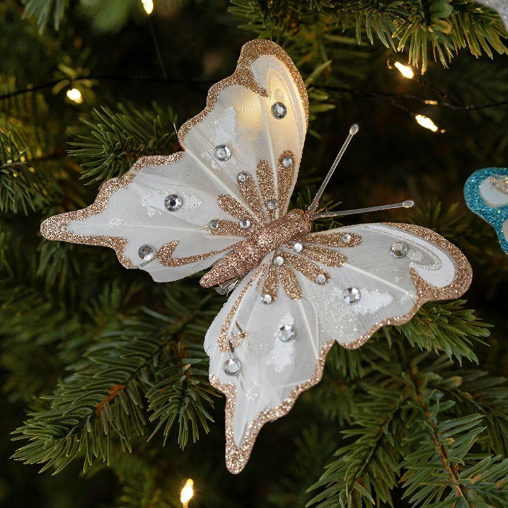 6pcs Plastic Artificial Butterfly Decoration Champagne Silver Blue Pink DIY Christmas Glitter Butterfly Hanging Ornament