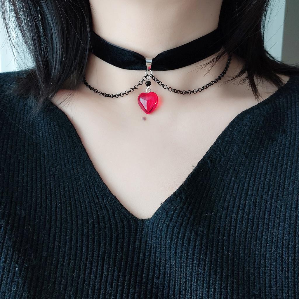 Dark gothic style, black velvet ribbon tassel chain, red heart-shaped pendant, choker collar, neckband, necklace for women