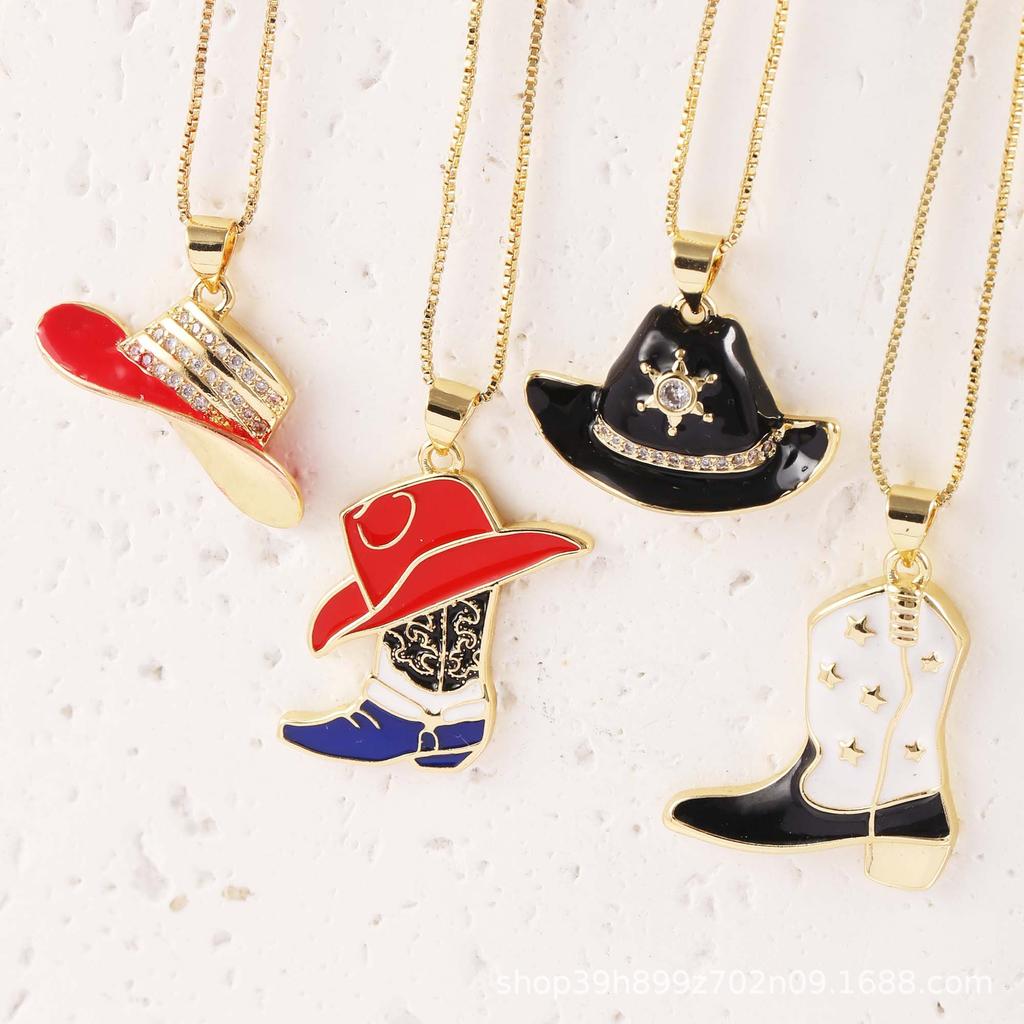 European-American Style Zircon-Inlaid Cowboy Hat Pendant and Boots Accessory in Copper Gold-Plated Necklace with Colorful Dripping Oil.