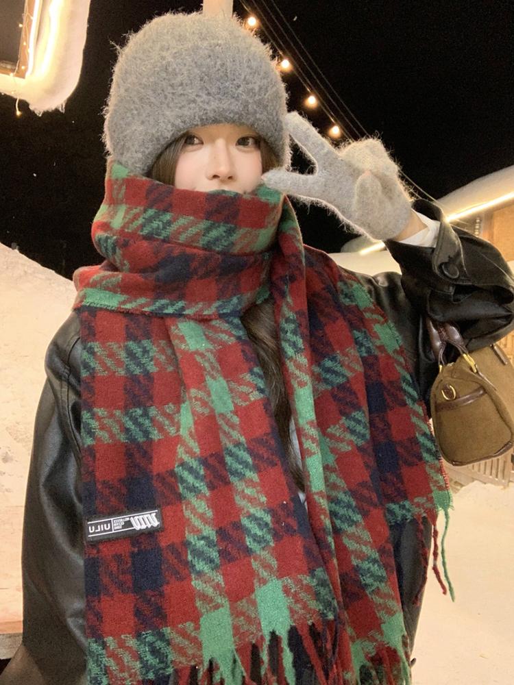 Women Red Green Plaid Tassel Knitted Scarf Headscarf Ladies Men Casual Warm Scarve Mujer Wrap Shawl New Unisex Winter Christmas