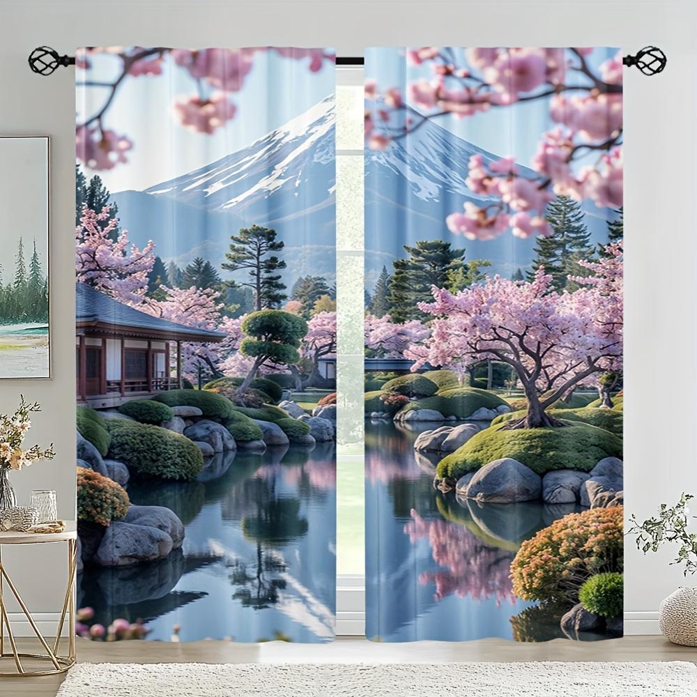 2PCS Sakura Fuji Scenic Sheer Curtains Cherry Blossom Rod Pocket for Living Room Bedroom Office Kitchen Holiday Home