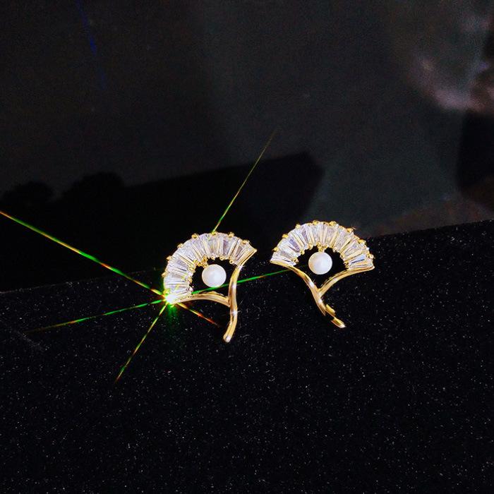 Temperament Imitation Zircon Earrings Design Sense Ginkgo Leaf Stud Earrings Women'S Simple Small Pearl Fan Earrings