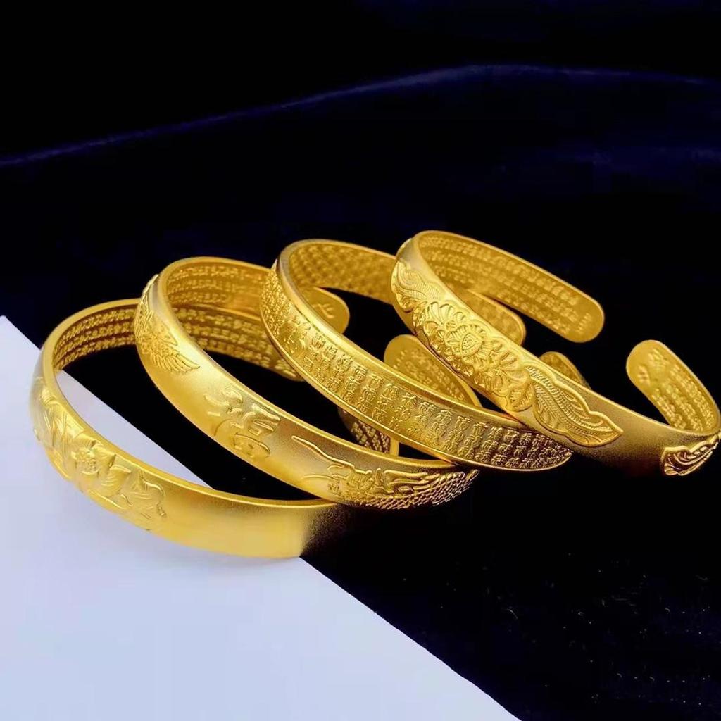 Vintage Dragon Phoenix Gold-Plated Bangle: Vietnamese Sand Gold, Women's Brass Open Bracelet