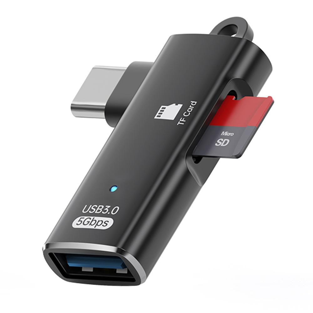 TYS-304 Angled Type-C OTG Adapter to USB 3.0 + TF Card Slot Converter for Mouse/Keyboard/Flash Drive/SSD