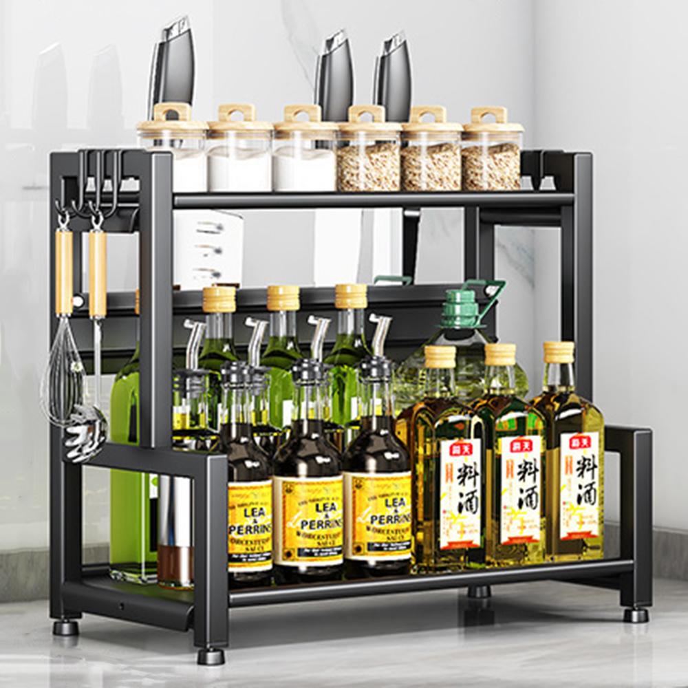 Carbon Steel 40cm Kitchen Storage Rack 2 Layer Seasoning Organizer Countertop Knife Shelf with Hook